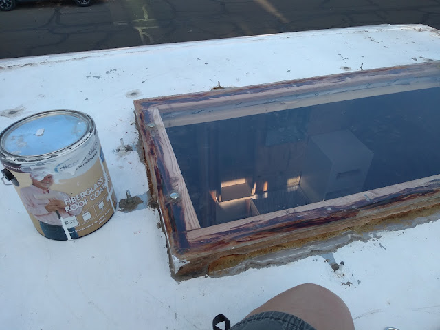 At this point I have already cut the gaping hole for my skylight, and it's covered with plywood. I only cut the hole big enough for the glass to show through - not the wood frame, as I wanted that on top of the roof.
